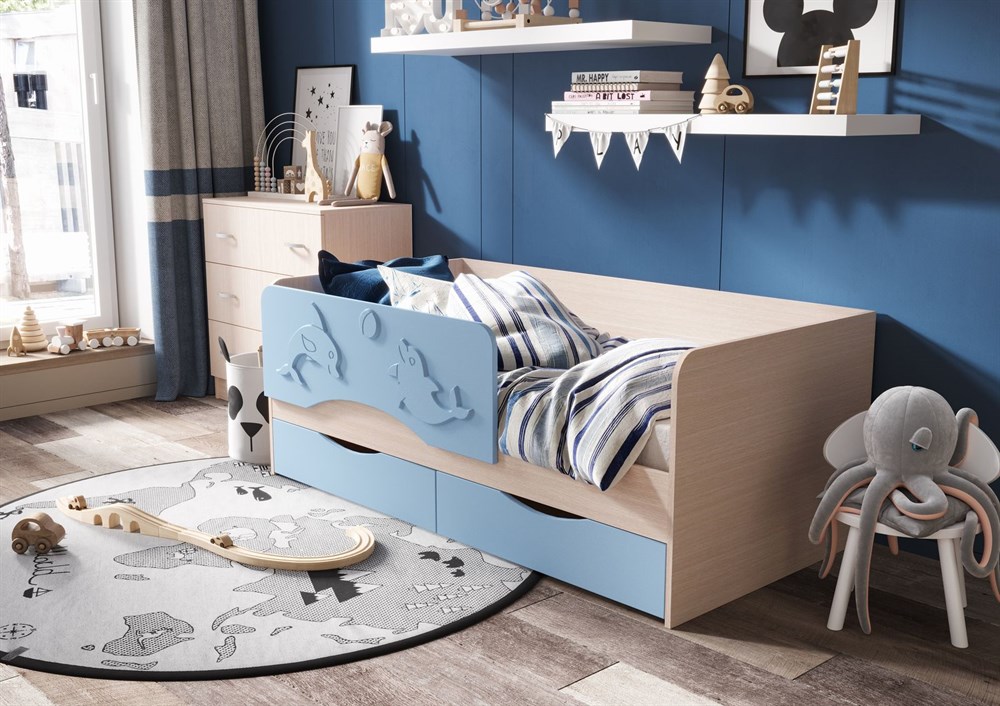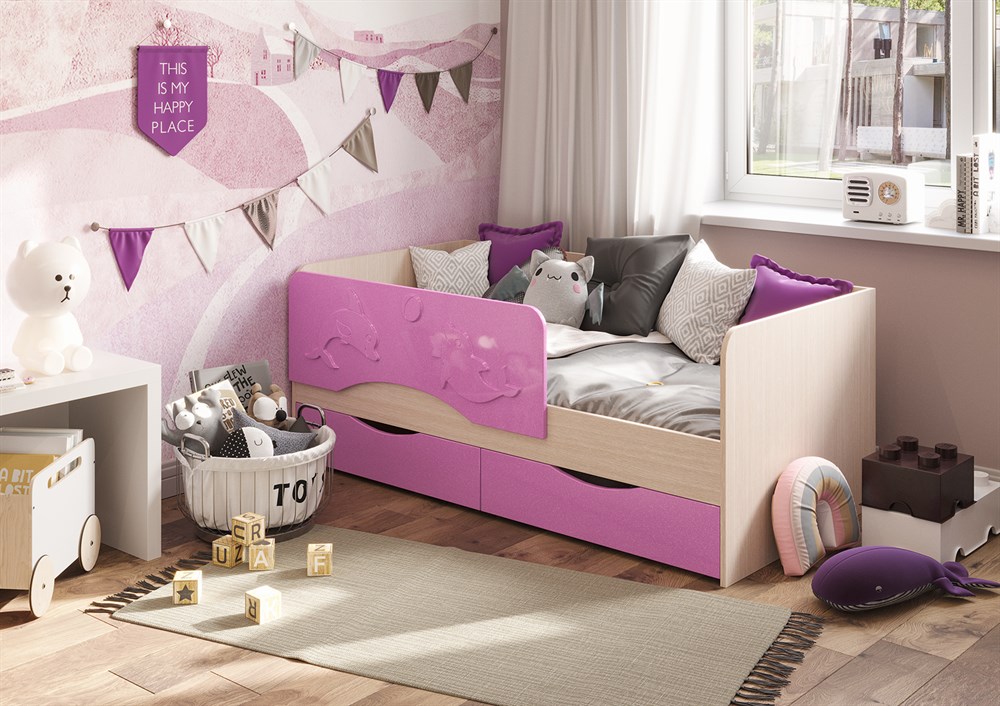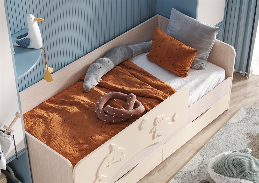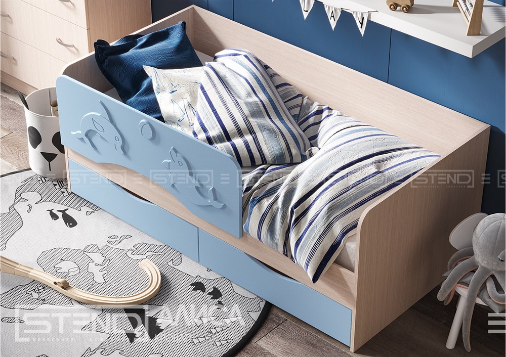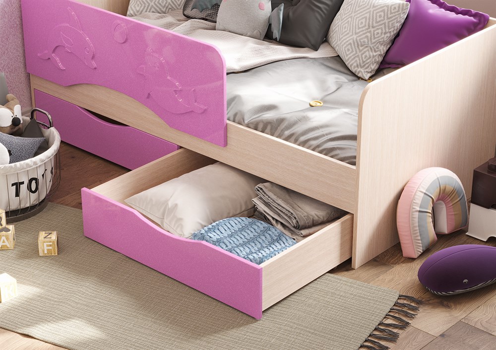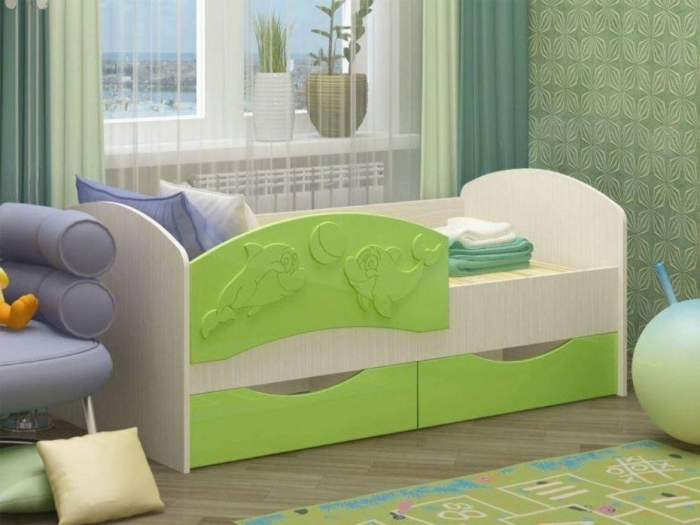 Кровать детская "Алиса" - отличное решение для детской комнаты. Фасад кровати оформлен защитным бортиком с рельефным изображением дельфина. В кровати предусмотрены вместительные ящики, где можно хранить игрушки или детскую одежду.