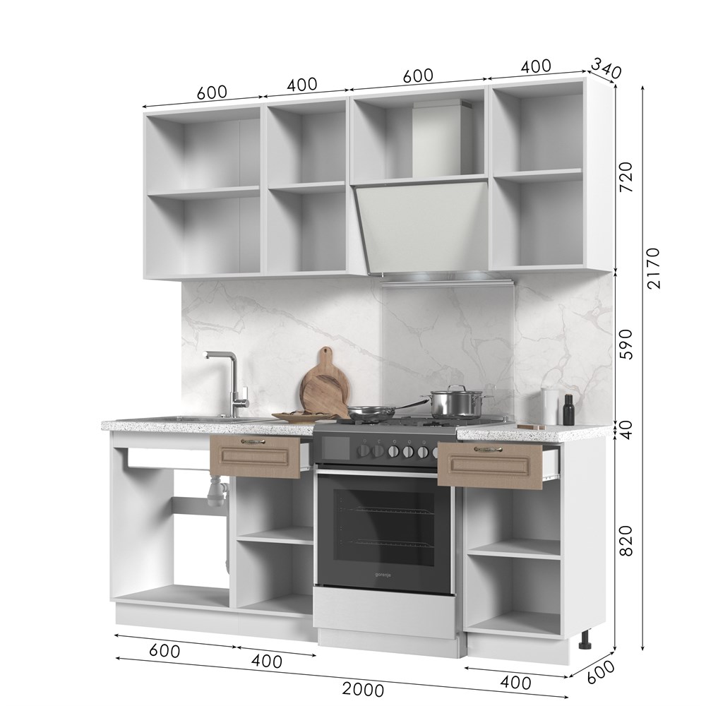 Кухонный гарнитур не комплектуется: столешницей, стеновой панелью, бытовой техникой и мойкой.