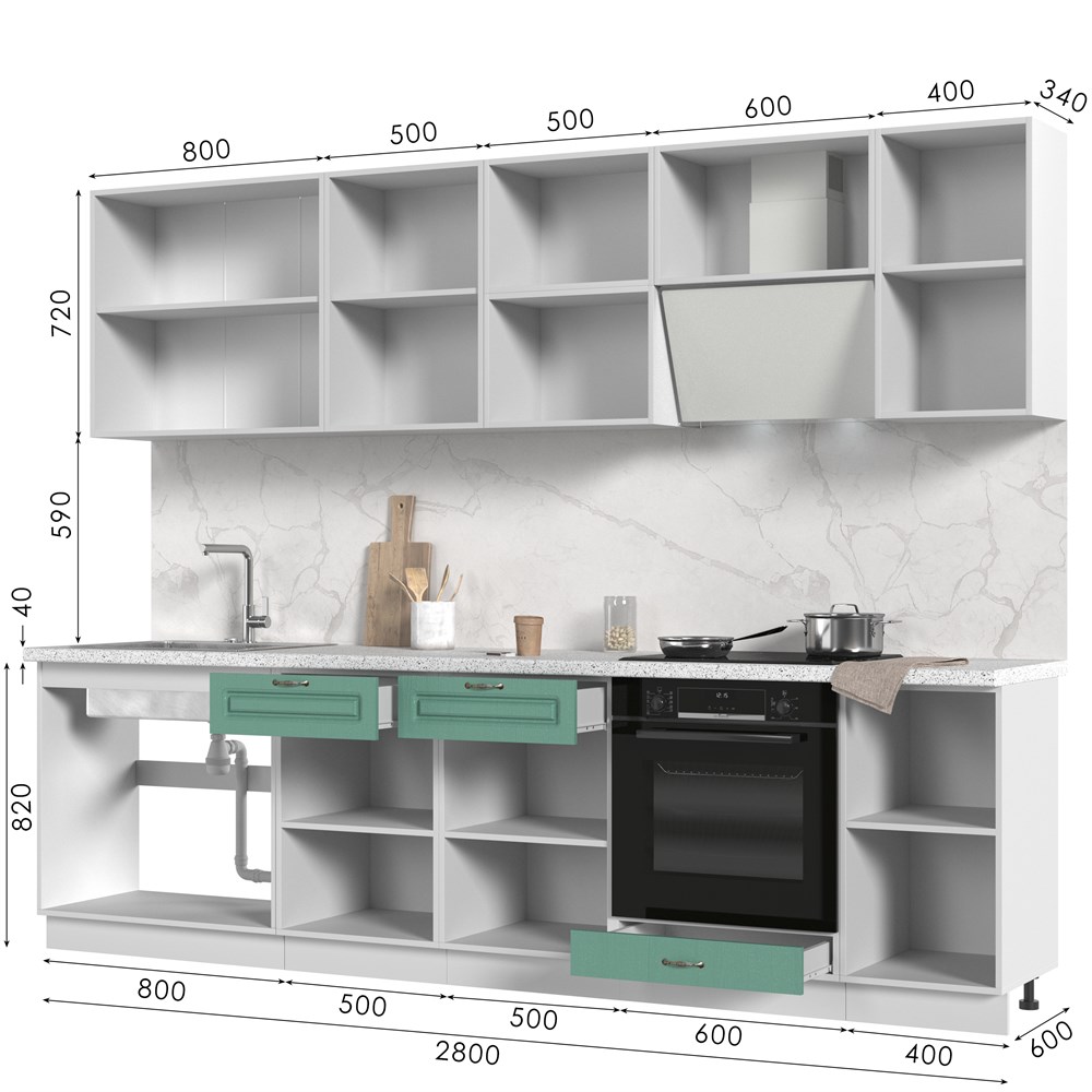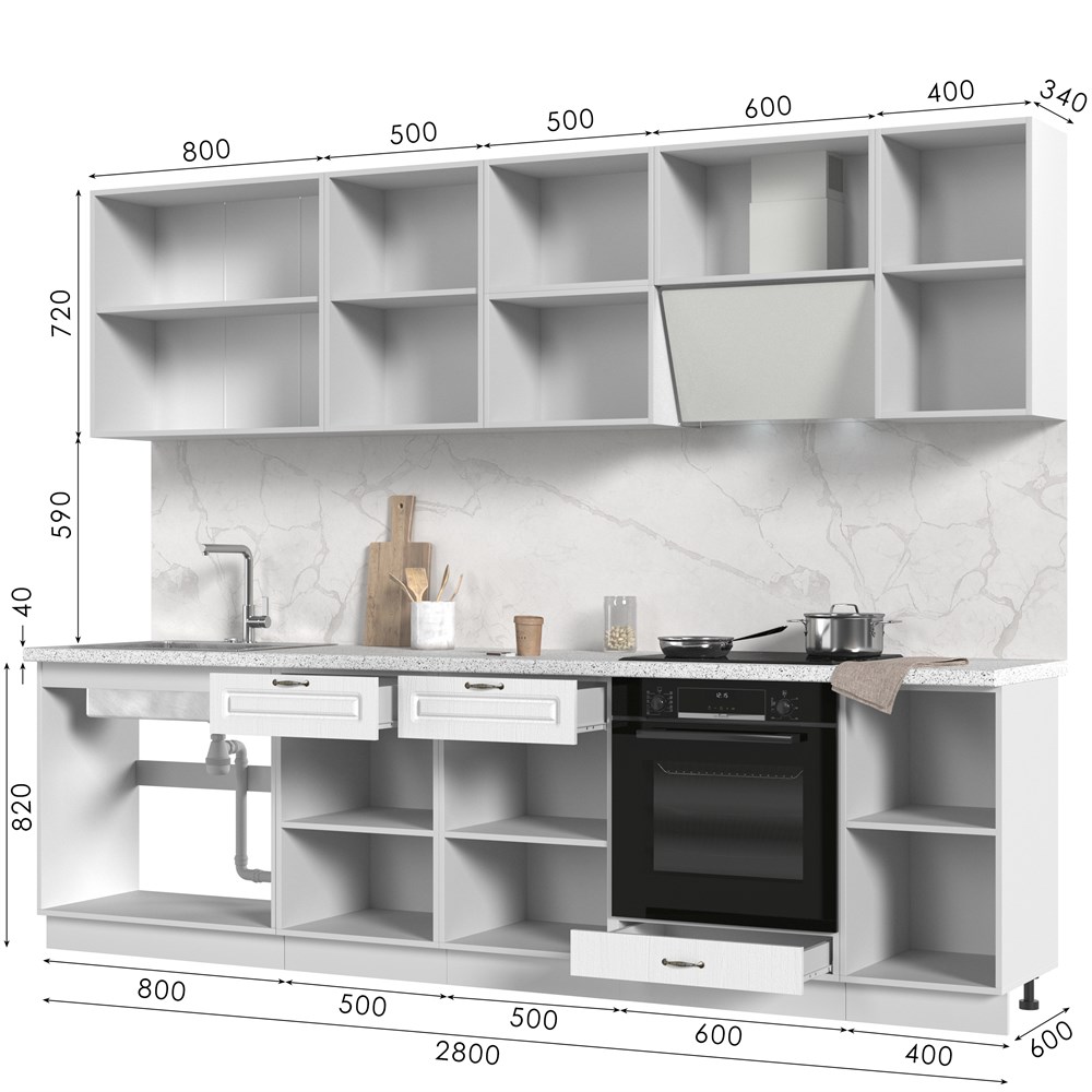 Кухонный гарнитур не комплектуется: столешницей, стеновой панелью, бытовой техникой и мойкой.